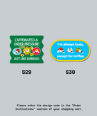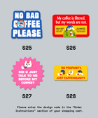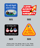 Show your love for coffee with our UV-printed stickers! They're UV and water resistant, making them perfect for everyday use. Each sticker measures approximately 5–6 cm (about 2–2.4 inches) in both width and length.